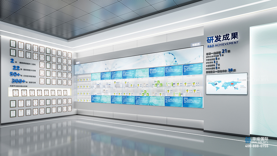 藥企的重中之重是新藥研發(fā)和核心技術(shù)。在研發(fā)成果展區(qū),陳列悅康藥業(yè)現(xiàn)有的創(chuàng)新藥和仿制藥,聚光燈打在產(chǎn)品上,在光影流動(dòng)間,專注每一種守護(hù)人類健康的藥品。通過疏密有致的專利墻,定格悅康藥業(yè)的每個(gè)榮耀時(shí)刻。