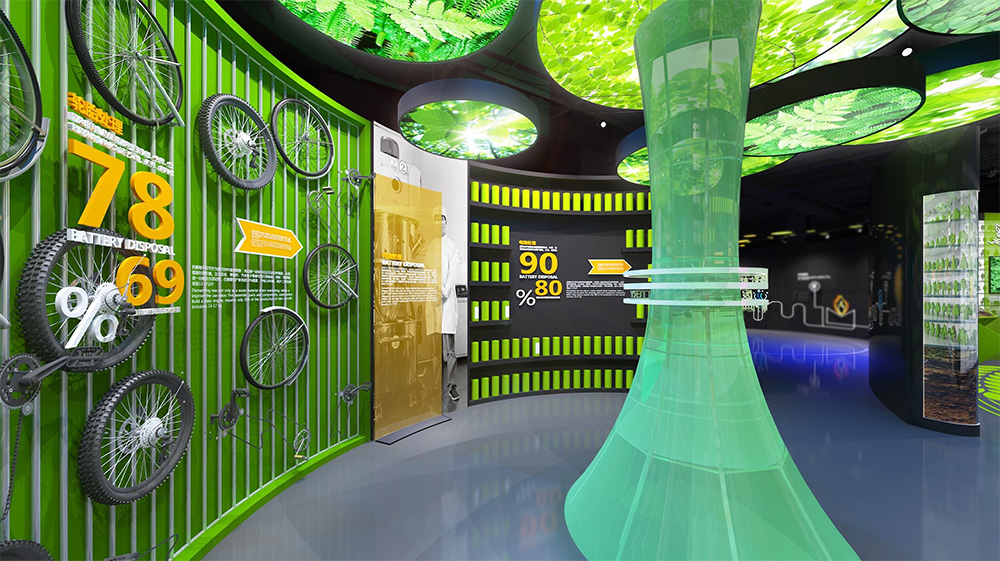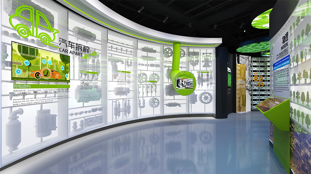 展館內(nèi)容和展示分區(qū)規(guī)劃上,除了做一些基礎(chǔ)的圖文科普知識外,還可以設(shè)置一些實物展示區(qū),將一些可以重復(fù)利用的垃圾變廢為寶,展館內(nèi)的面積有限,所以不是所有展館都可以做到參觀和垃圾分揀流水線展現(xiàn)在同一個空間,這就需要設(shè)置一些多媒體展示區(qū),通過高科技展示手段實現(xiàn)這方面需求。