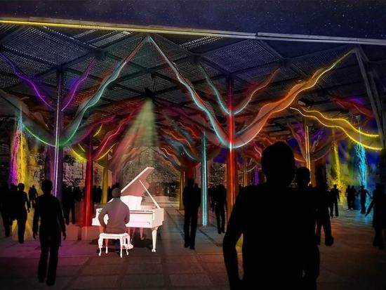 以“宮商角徴羽”傳統(tǒng)五音文化為理念打造的海心沙作品區(qū)域是本屆燈光節(jié)的核心和重點區(qū)域。
